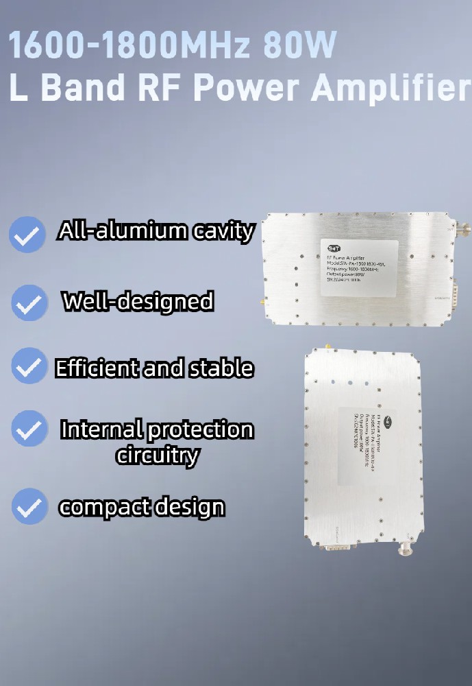 Радиочастотный усилитель мощности 1600 - 1800 МГц предназначен для применения на средних частотах и охватывает частотный диапазон 1600 - 1800 МГц с выходной мощностью до 80 Вт. Он идеально подходит для беспроводной связи, радиолокационных систем и электронной войны. Этот усилитель обеспечивает высокую эффективность и низкие искажения, обеспечивает стабильную производительность в различных условиях окружающей среды и обеспечивает отличную целостность сигнала.