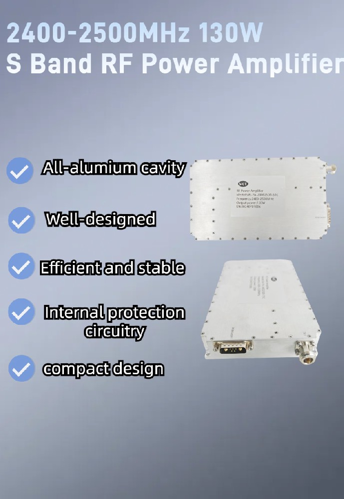 O Amplificador De Potência RF 2400-2500MHz é Projetado Para Aplicações De Banda S, Cobrindo A Faixa De Frequência De 2400-2500MHz Com Uma Potência De Saída De Até 130W. É Ideal Para Comunicação Sem Fio, Aquecimento Industrial, Imagem Lactente De Microondas E Outras Aplicações Relacionadas à Banda S. Este Amplificador Apresenta Alta Linearidade E Eficiência, Garantindo Saída De Alto Desempenho Em Vários Ambientes Complexos, Mantendo A Qualidade E Estabilidade Do Sinal.